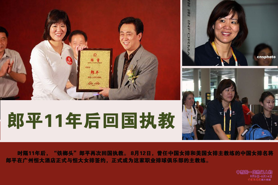 中新網(wǎng)本周熱點人物之郎平——曾任中國女排和美國女排主教練的中國女排名將郎平8月12日在廣州恒大酒店正式與恒大女排簽約,正式成為這家職業(yè)排球俱樂部的主教練。這標志著時隔11年,郎平再次回國執(zhí)教。