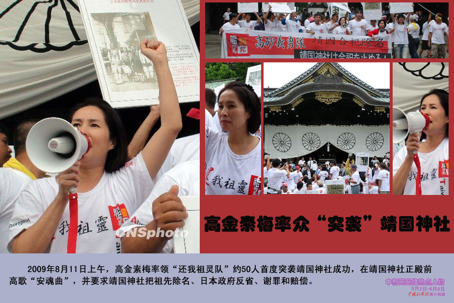 中新網(wǎng)本周熱點(diǎn)人物之高金素梅——高金素梅一行于上午9時(shí)30分左右搭車(chē)出其不意地抵達(dá)靖國(guó)神社,隨即高舉“要求靖國(guó)還我祖靈”等大型橫布條標(biāo)語(yǔ),浩浩蕩蕩地列隊(duì)走向靖國(guó)神社的正殿,并高喊口號(hào)。靖國(guó)神社的警衛(wèi)人員前往阻擋,企圖奪走標(biāo)語(yǔ)布條,雙方發(fā)生肢體沖突。