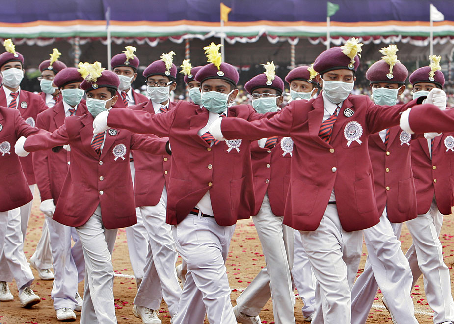 慶祝獨(dú)立62周年閱兵式上的印度童軍在做隊(duì)列表演。