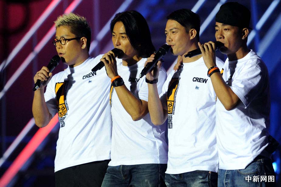 圖為林曉峰、鄭伊健、謝天華、陳小春在現(xiàn)場(chǎng)演出。