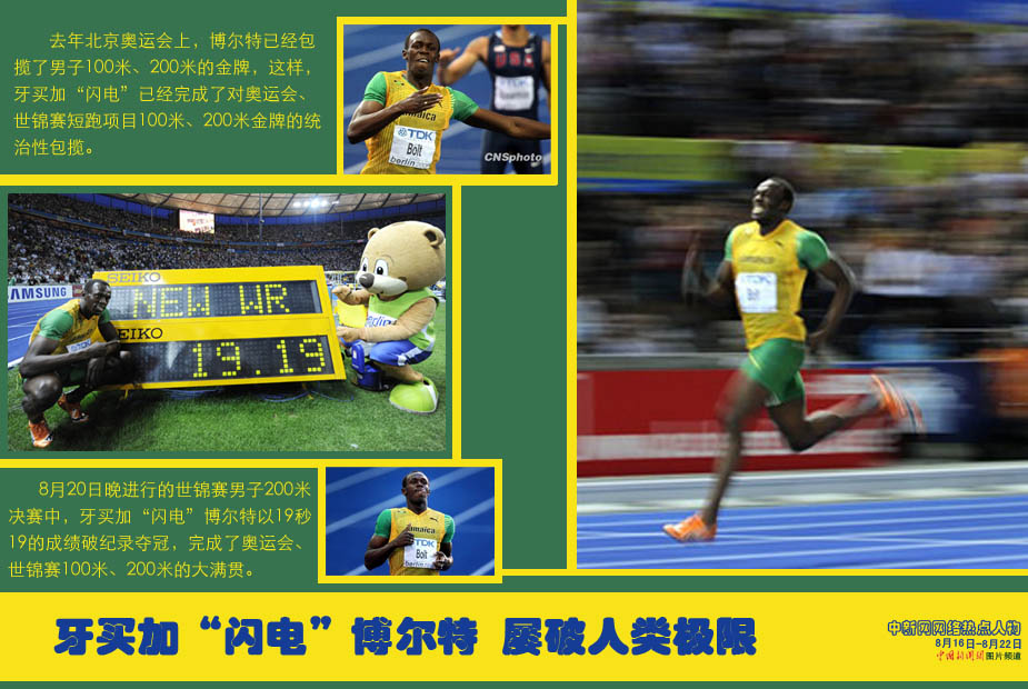 中新網(wǎng)本周熱點(diǎn)人物之——博爾特 第12屆國際田徑聯(lián)合會(huì)世界田徑錦標(biāo)賽男子200米決賽在柏林奧林匹克體育場舉行,已經(jīng)獲得100米冠軍并打破世界紀(jì)錄的牙買加超級名星博爾特以19.19秒的成績獲得冠軍并打破世界紀(jì)錄。