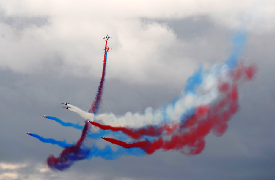 8月21日,在俄羅斯茹科夫斯基市舉行的第九屆國際航空航天展覽會(huì)上,法國著名的“法蘭西巡邏兵”飛行表演隊(duì)進(jìn)行了精彩的飛行表演。
