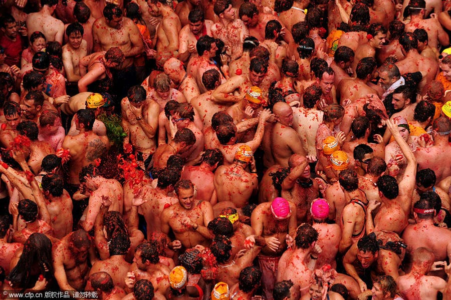 8月26日,西班牙東南部小鎮(zhèn)Bunol當日迎來傳統(tǒng)的西紅柿節(jié)。大約4萬名狂歡者在1小時內扔掉了11萬公斤西紅柿。來源:中國新聞網(wǎng)