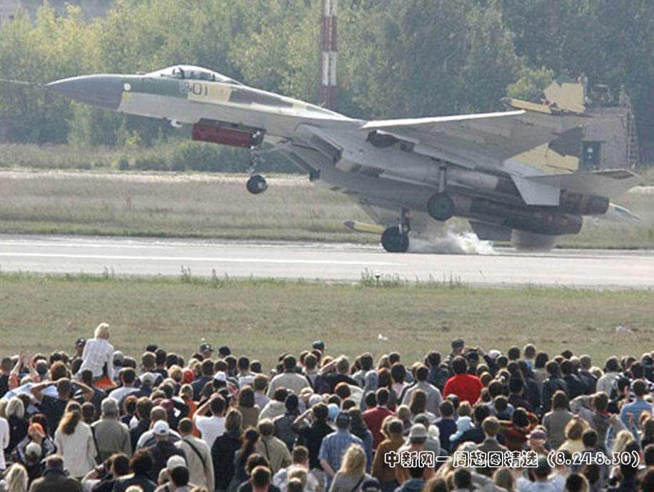 8月24日,莫斯科航展閉幕日上進(jìn)行飛行表演的蘇-35戰(zhàn)機(jī),在技能高超的飛行員駕駛下,玩起了單輪著陸特技動作,令現(xiàn)場的觀眾大飽眼神。圖片來源:中國新聞網(wǎng)