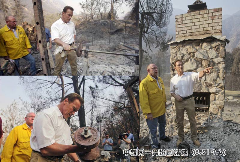 當?shù)貢r間9月3日,加州州長施瓦辛格探訪了洛杉磯市圖洪加附近被火災燒毀的地區(qū)。圖片來源:中國新聞網