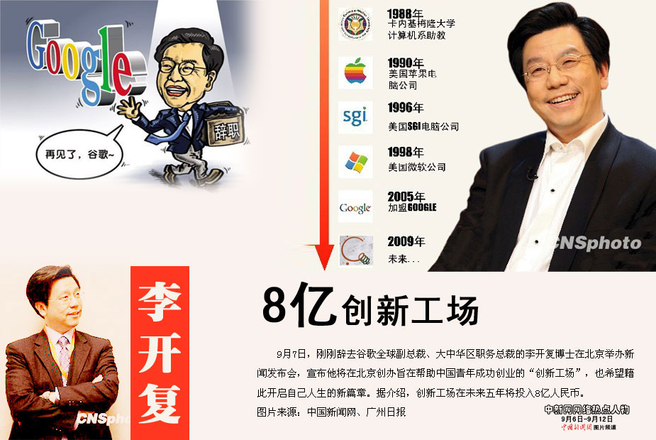 中新網(wǎng)本周熱點(diǎn)人物之——李開(kāi)復(fù) 剛剛辭去谷歌全球副總裁、大中華區(qū)職務(wù)總裁的李開(kāi)復(fù)博士在北京舉辦新聞發(fā)布會(huì),宣布他將在北京創(chuàng)辦旨在幫助中國(guó)青年成功創(chuàng)業(yè)的“創(chuàng)新工場(chǎng)”,也希望藉此開(kāi)啟自己人生的新篇章。據(jù)介紹,創(chuàng)新工場(chǎng)在未來(lái)五年將投入8億人民幣。