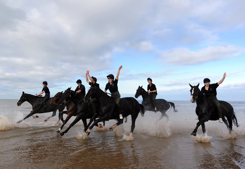9月16日,英國皇家騎兵團在英格蘭黑池附近的海水中暢游。在日常儀式職責之余,騎兵團帶著馬匹來這里放松休息。圖片來源:中國新聞網(wǎng)