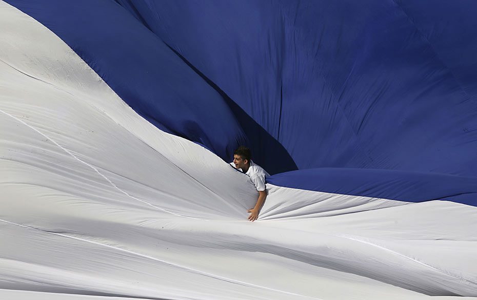 9月17日,在耶路撒冷的一個(gè)體育場(chǎng)內(nèi),一名以色列男孩在一幅巨大的、鋪展開(kāi)的旗子上玩耍。它被吉尼斯世界紀(jì)錄評(píng)為世界上最大的旗子。圖片來(lái)源:中國(guó)新聞網(wǎng)