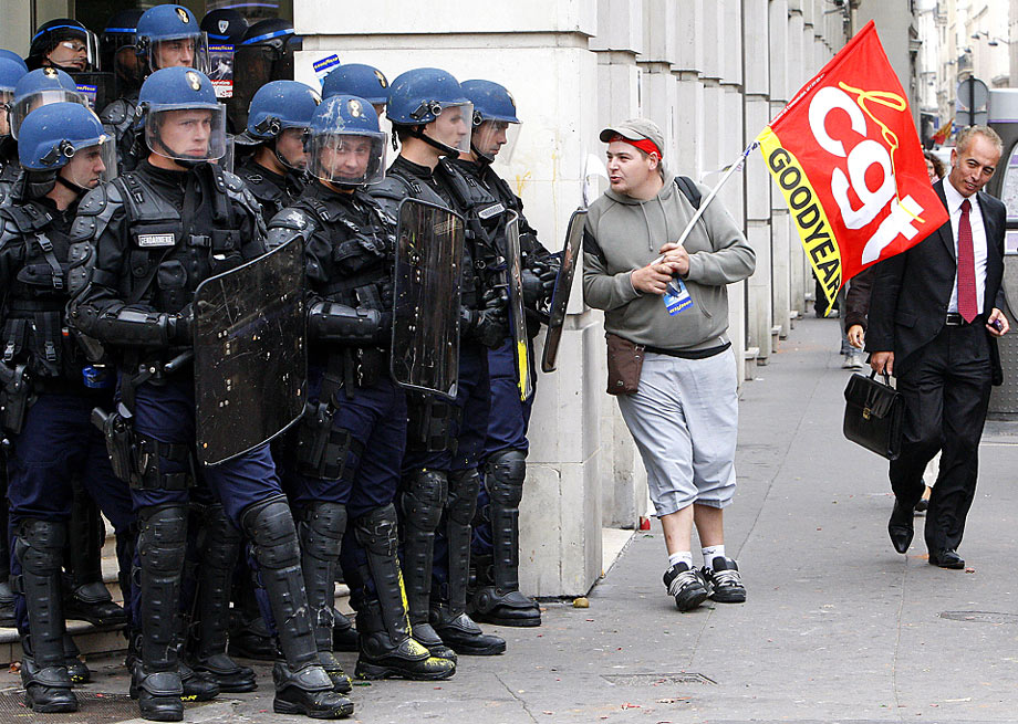 9月17日,在巴黎的金融市場(chǎng)管理局總部前,一名固特異公司雇員與保衛(wèi)總部大樓的防暴警察面對(duì)面。當(dāng)天,數(shù)百人舉行抗議反對(duì)汽車制造業(yè)裁員和重組。圖片來源:中國新聞網(wǎng)