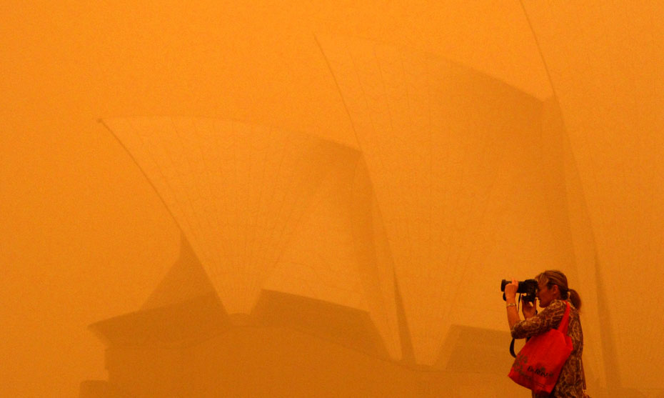 澳大利亞悉尼23日出現(xiàn)罕見的沙塵暴,加上風速每小時上百公里的強風吹襲,全城籠罩在一片橘紅色的塵霧中,由于能見度相當?shù)停w機和渡輪暫時停飛或停駛。