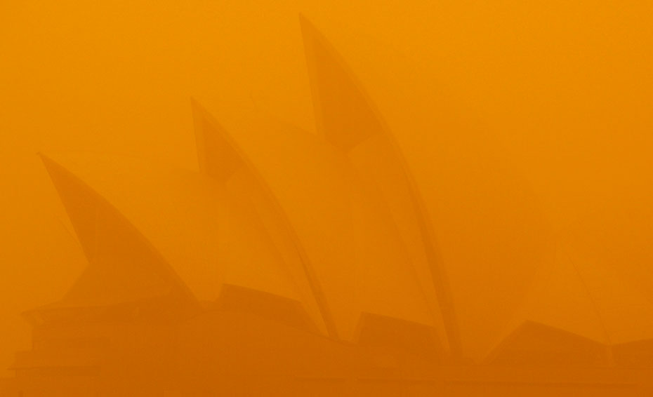 澳大利亞悉尼23日出現(xiàn)罕見的沙塵暴,加上風(fēng)速每小時上百公里的強風(fēng)吹襲,全城籠罩在一片橘紅色的塵霧中,由于能見度相當?shù),飛機和渡輪暫時停飛或停駛。