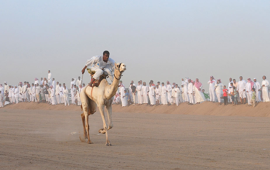 9月25日,在沙特阿拉伯東部的哈利斯,駱駝騎士們騎著自己的座駕在大漠中飛馳。圖片來(lái)源:中國(guó)新聞網(wǎng)