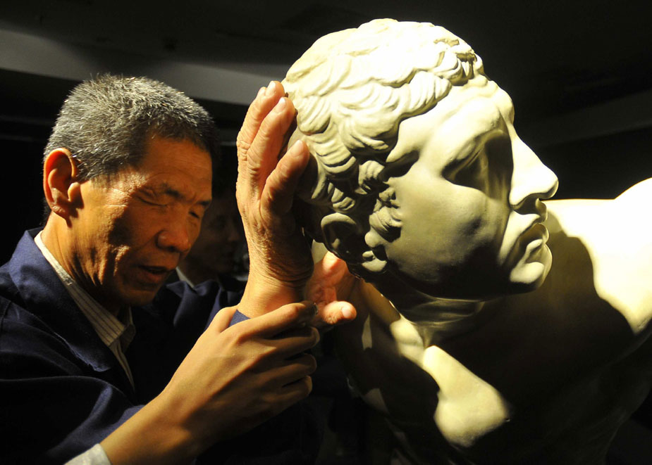 21日,由法國盧浮宮博物館、中華世紀壇世界藝術(shù)館等機構(gòu)聯(lián)合主辦的《觸·覺——從盧浮宮到世紀壇》藝術(shù)展在中華世紀壇世界藝術(shù)館開幕,共展出公元前二世紀到十九世紀西方經(jīng)典雕塑的復制品和中國當代藝術(shù)品二十三件。這是中國大陸首次為視覺殘障人士舉辦的藝術(shù)展。該展十一月起開始在福州、武漢及香港等地巡展。圖為視障人士利用觸覺方式欣賞精典作品。潘旭臨 攝圖片來源:中國新聞網(wǎng)