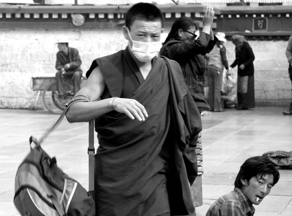2009年的拉薩,戴著口罩的喇嘛。