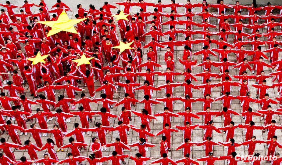 9月22日,江西省德興市銅礦第二小學(xué)1000多名小學(xué)生,身穿紅色校服,排列整齊的在校園內(nèi)組成了一個長42米、寬28,總面積達(dá)1170多平方米的巨型國旗,為迎接建國60周年喝彩,同時也讓同學(xué)們上了一堂愛國主義教育課。 中新社發(fā) 卓忠偉 攝