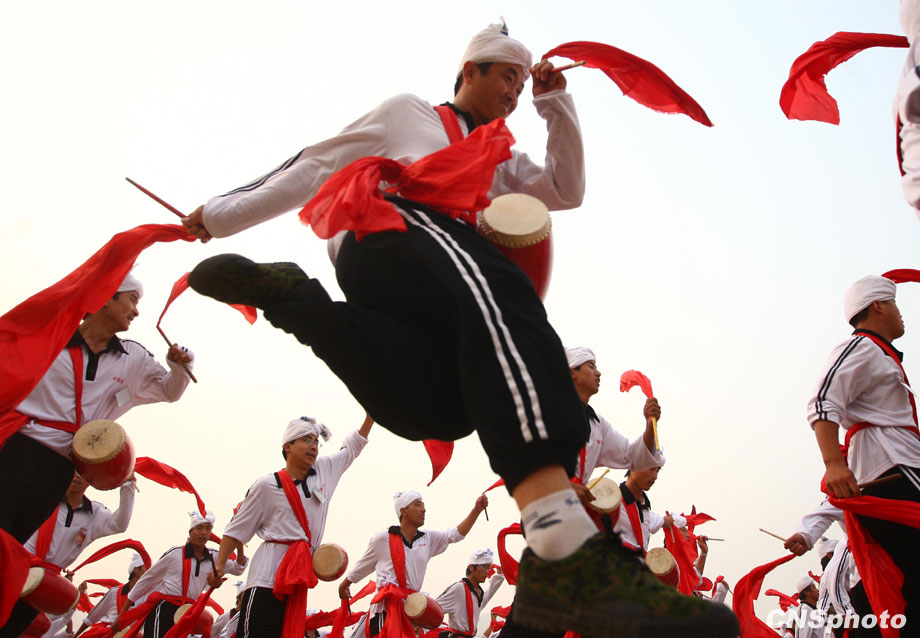 9月16日,千余名來自陜西安塞的腰鼓隊(duì)員在北京密云訓(xùn)練基地和其他方陣合練。該方陣隊(duì)員全部是來自陜西省延安市安塞縣的農(nóng)民,10月1日他們將走在群眾游行隊(duì)伍中,在天安門城樓前舞起安塞腰鼓。該方陣也是群眾游行隊(duì)伍中唯一一支京外隊(duì)伍,唯一一個全部由農(nóng)民組成的方陣。 中新社發(fā) 杜洋 攝