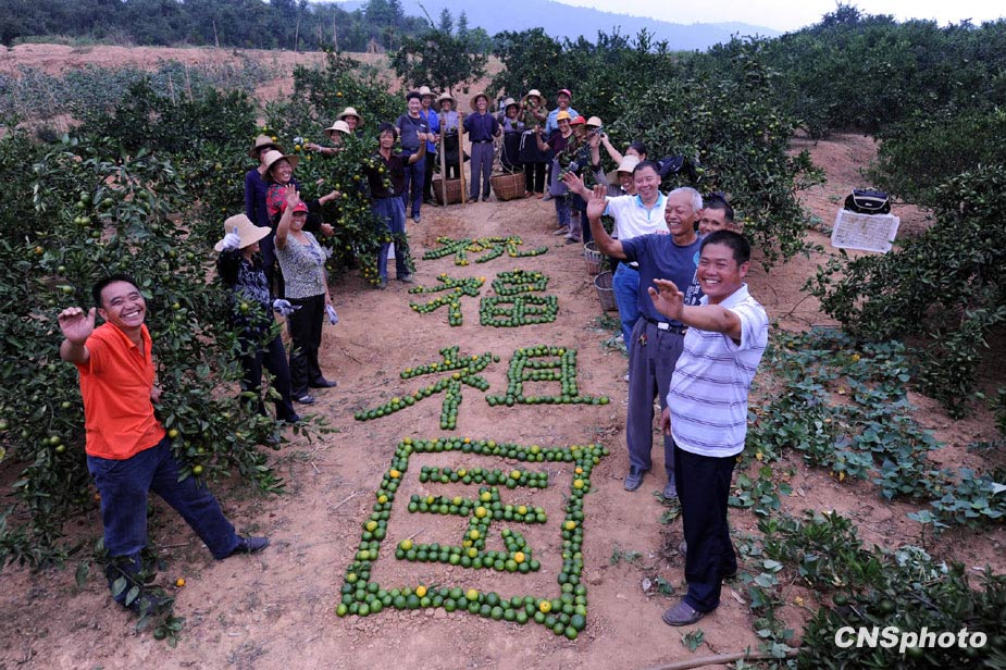 為慶祝新中國成立六十周年,湖南石門縣橘農(nóng)近日用采摘的早熟蜜橘,在橘園擺成“祝福祖國”四個(gè)大字,表達(dá)對(duì)祖國六十華誕的美好祝愿。中新社發(fā) 賀新初 攝