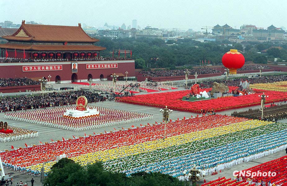圖為參加1999年國慶慶典的群眾游行方陣和背景組字隊伍在天安門廣場上形成鮮艷的色塊效果。 中新社發(fā) 任晨鳴 攝