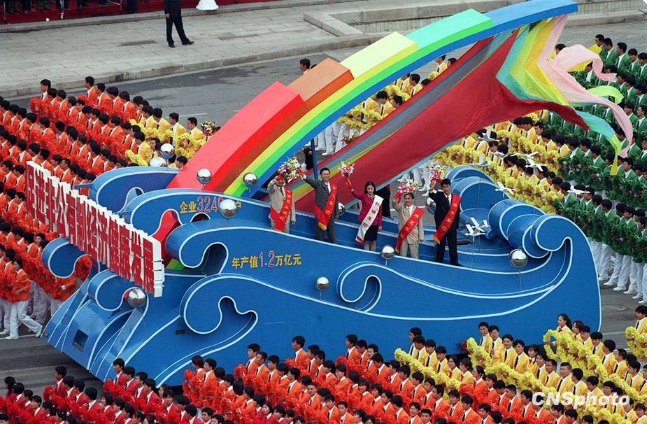 圖為1999年國(guó)慶群眾游行隊(duì)伍中的“國(guó)民經(jīng)濟(jì)發(fā)展新的活力” 方陣。中新社發(fā) 任晨鳴 攝