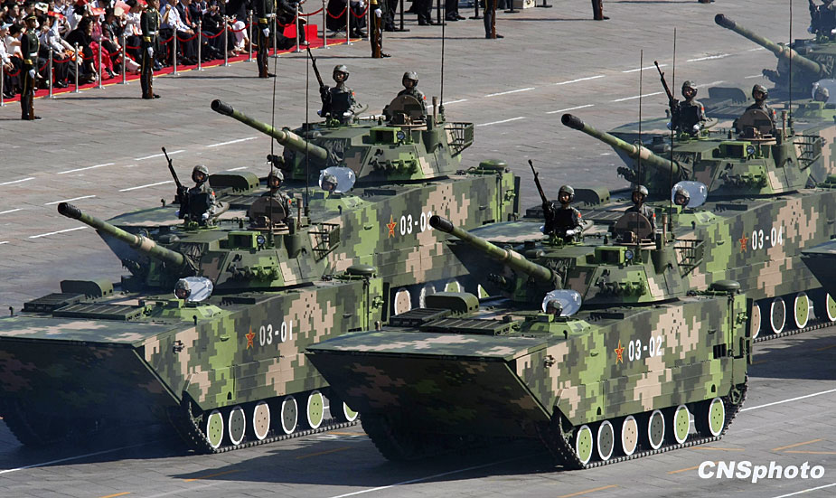 2009年10月1日,中華人民共和國(guó)成立60周年慶祝大會(huì)在北京天安門廣場(chǎng)舉行。圖為兩棲突擊車方隊(duì)。中新社發(fā) 趙振清 攝