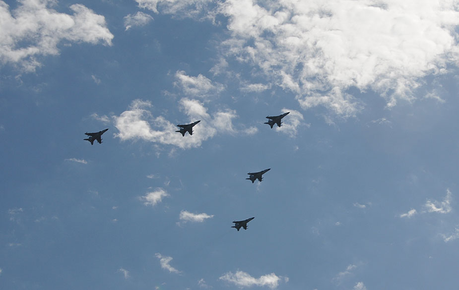 2009年10月1日,中華人民共和國成立60周年慶祝大會在北京天安門廣場舉行。圖為殲擊轟炸機梯隊飛過天安門廣場上空。中新網(wǎng)記者 攝