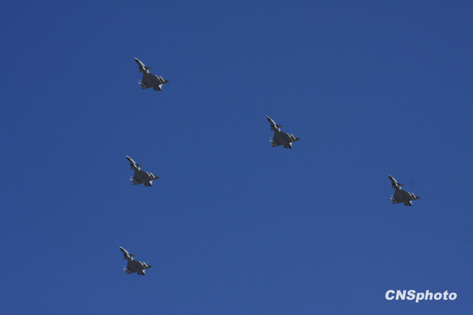 2009年10月1日,中華人民共和國成立60周年慶祝大會在北京天安門廣場舉行。圖為殲擊機(jī)梯隊飛過天安門廣場上空。中新社發(fā) 郭國權(quán) 攝