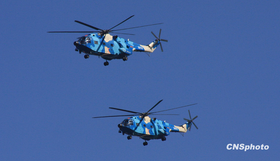 2009年10月1日,中華人民共和國成立60周年慶祝大會在北京天安門廣場舉行。圖為搜救、運(yùn)輸直升機(jī)梯隊。中新社發(fā) 郭國權(quán) 攝