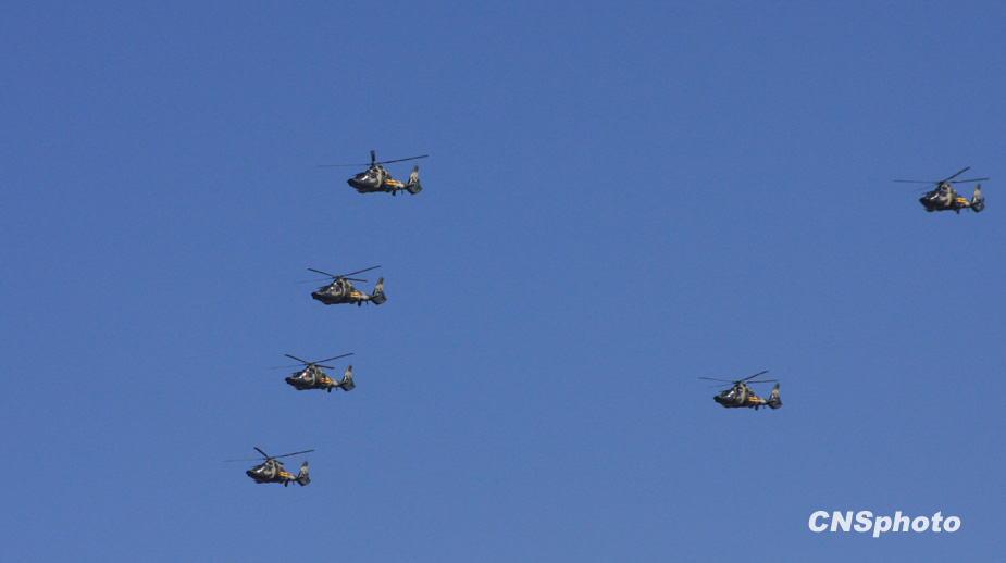 2009年10月1日,中華人民共和國成立60周年慶祝大會在北京天安門廣場舉行。圖為武裝直升機梯隊飛過天安門廣場上空。中新社發(fā) 郭國權(quán) 攝