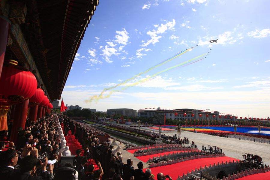 2009年10月1日,首都各界慶祝中華人民共和國成立60周年大會(huì)在北京舉行?罩蟹疥(duì)在北京上空駛過。