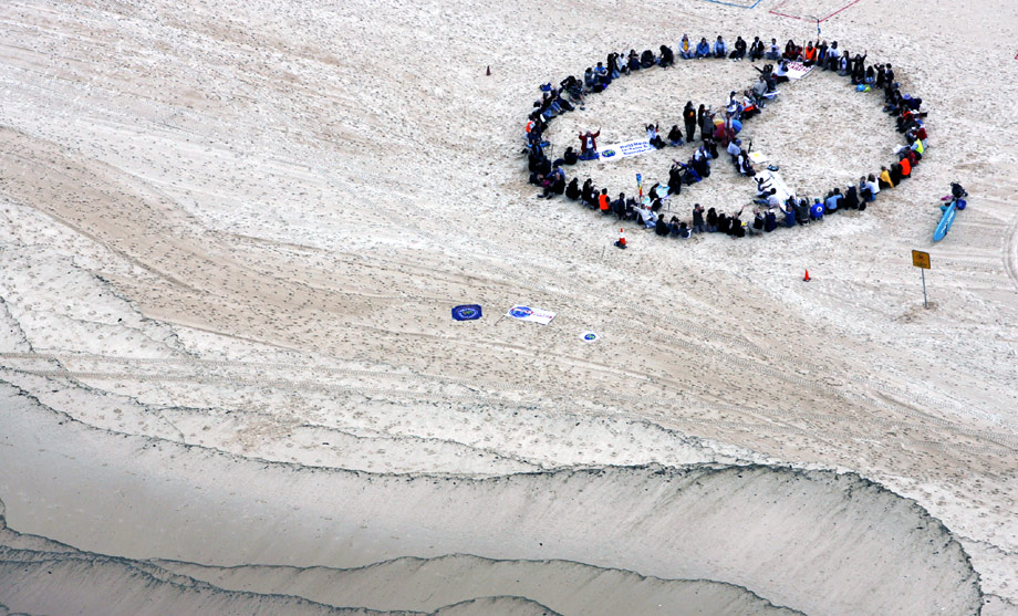 10月4日,一個在全球范圍內(nèi)祈求和平的活動在多個國家展開,呼吁結(jié)束戰(zhàn)爭、消除核武器和結(jié)束各種暴力行為。在澳大利亞悉尼附近的海灘上,參加和平游行的人組成和平圖案。來源:中國新聞網(wǎng)