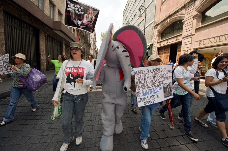 10月4日,在墨西哥首都墨西哥城,參加世界動(dòng)物日活動(dòng)的人們頭帶面具,手舉圖片,呼吁人們關(guān)注動(dòng)物權(quán)益。