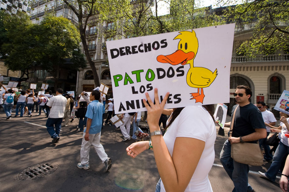 10月4日,在墨西哥首都墨西哥城,參加世界動物日活動的人們頭帶面具,手舉圖片,呼吁人們關注動物權益。