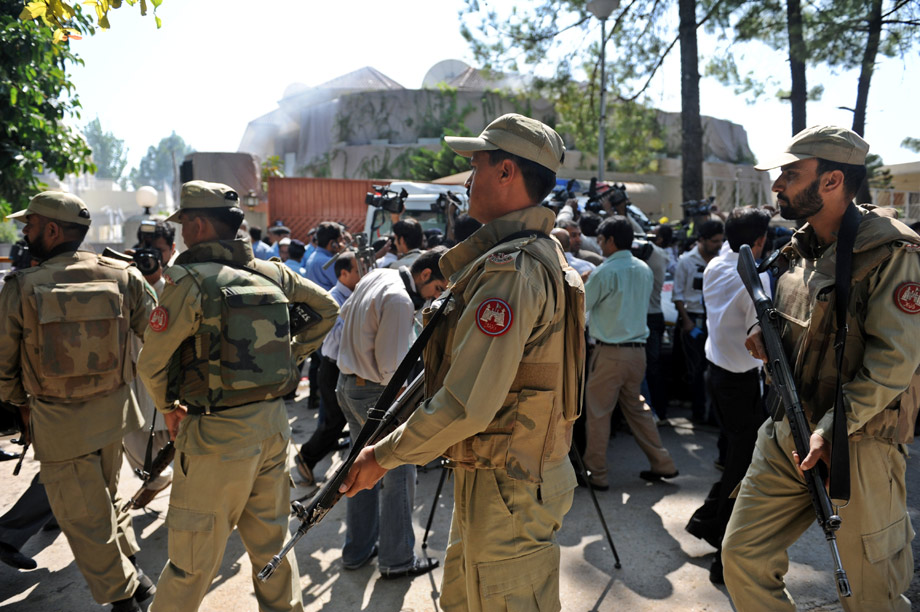 中新網(wǎng)10月5日電 據(jù)法新社報道,聯(lián)合國位于巴基斯坦伊斯蘭堡的辦公樓內(nèi)5日發(fā)生自殺式襲擊爆炸,導(dǎo)致3人死亡。報道稱,當(dāng)時有80人在該辦公樓工作,遇害者中包括一名外國人,另外2人是巴基斯坦婦女。還有6名傷者被送往醫(yī)院。圖為安全人員在發(fā)生爆炸的辦公室附近警戒。