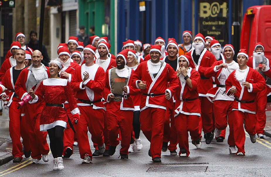 10月6日,英國(guó)倫敦市中心100多位圣誕老人為籌集乳腺癌護(hù)理善款而參加歡樂跑活動(dòng)。圖片來(lái)源:中國(guó)新聞網(wǎng)