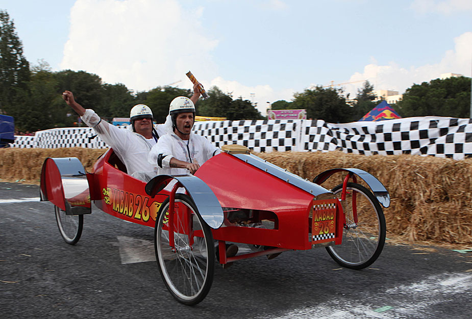 50輛“肥皂盒車”10月7日參加了耶路撒冷舉行的“肥皂盒車”趣味競(jìng)賽。賽道設(shè)置在市中心一條大街的一段斜坡上,比賽者駕駛各種千奇百怪的賽車從起點(diǎn)一路滑下。圖片來(lái)源:中國(guó)新聞網(wǎng)
