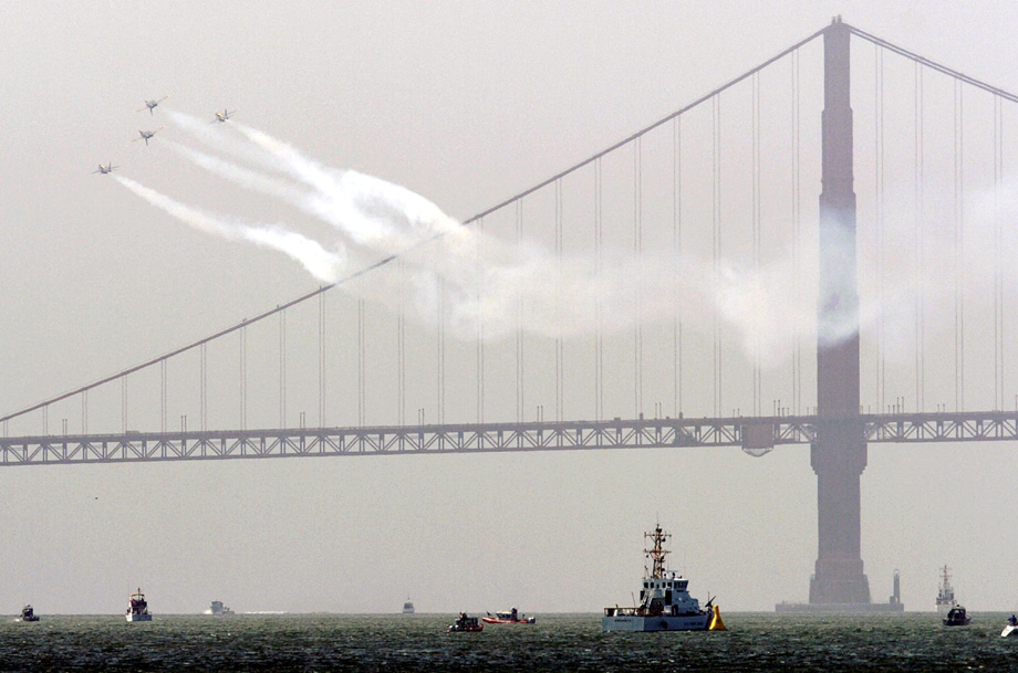 2009年10月8日,美軍飛機(jī)在舊金山灣上空進(jìn)行飛行演練。一年一度的舊金山艦隊(duì)周將于10月10日開幕,屆時(shí)會(huì)有船艦游行和飛行表演等活動(dòng)。 來源:中國(guó)新聞網(wǎng)