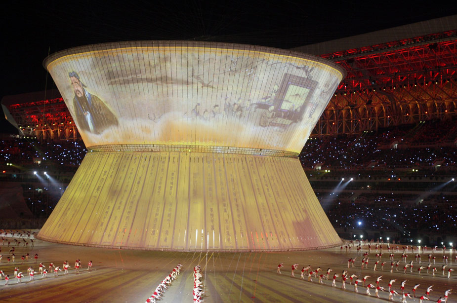 十月十六日晚,中華人民共和國第十一屆運動會在山東濟南奧體中心隆重開幕。圖為“孔子”現(xiàn)身全運會開幕式。中新社發(fā) 湯彥俊 攝