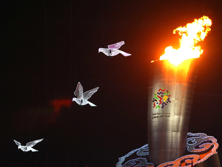 十月十六日晚,中華人民共和國第十一屆運(yùn)動會在山東濟(jì)南奧體中心隆重開幕。圖為第十一屆全國運(yùn)動會圣火在山東濟(jì)南點(diǎn)燃。中新社發(fā) 富田 攝