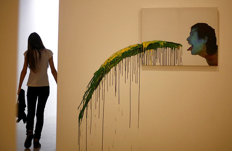 周日(10月11日),塞爾維亞貝爾格萊德舉行的十月藝術(shù)沙龍展上,一名參觀者走過(guò)一幅藝術(shù)作品。圖片來(lái)源:中國(guó)新聞網(wǎng)