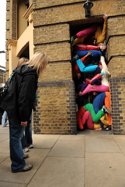 10月16日,來(lái)自?shī)W地利的藝術(shù)家威利·多勒帶著他的城市空間人體藝術(shù)團(tuán)隊(duì),在倫敦街頭進(jìn)行藝術(shù)表演。幾十位表演者把自己的身體擠進(jìn)通道入口、壁凹和任何能找得到的公共建筑的縫隙內(nèi),供人們欣賞。