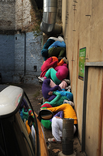 10月16日,來自奧地利的藝術(shù)家威利·多勒帶著他的城市空間人體藝術(shù)團隊,在倫敦街頭進行藝術(shù)表演。幾十位表演者把自己的身體擠進通道入口、壁凹和任何能找得到的公共建筑的縫隙內(nèi),供人們欣賞。