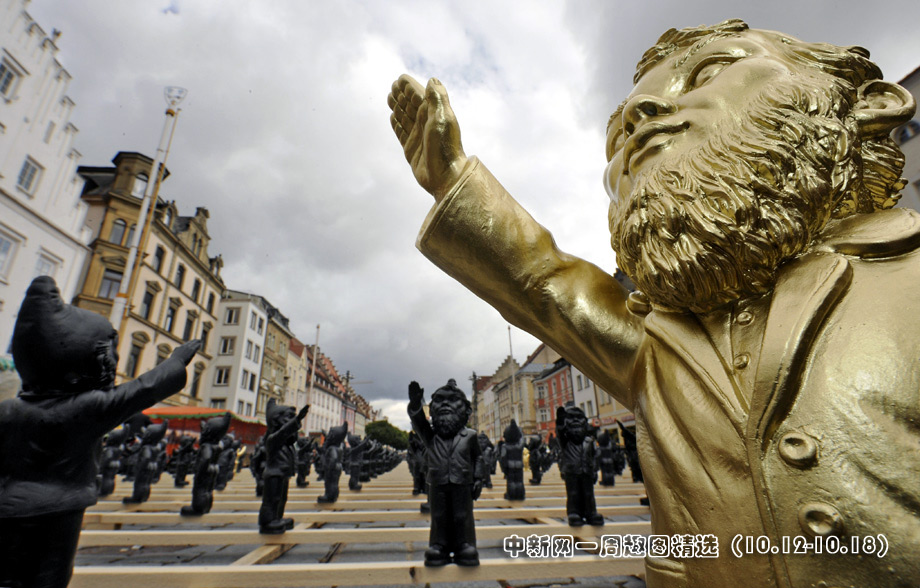 10月14日,德國施特勞賓市街頭擺放了1250個“行納粹禮的花園土地神”,目的在于提醒人們警惕法西斯思想,反對使用法西斯思想控制大眾。圖片來源:中國新聞網(wǎng)
