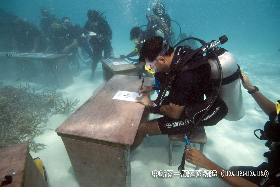 10月17日,印度洋島國(guó)馬爾代夫首次在水下召開內(nèi)閣會(huì)議。圖片來源:中國(guó)新聞網(wǎng)
