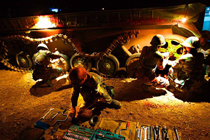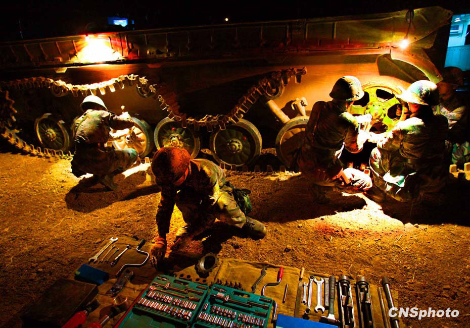 當(dāng)晚國防大學(xué)防務(wù)學(xué)院、空軍指揮學(xué)院的外軍學(xué)員,以及英國、以色列、土耳其、巴基斯坦等國軍事觀察員親臨現(xiàn)場觀摩了后勤保障戰(zhàn)斗準備、自行榴彈炮占領(lǐng)陣地、裝甲車輛“摸黑”開進等戰(zhàn)斗要素。圖為戰(zhàn)地搶修裝甲戰(zhàn)車。中新社發(fā) 宋吉河 攝