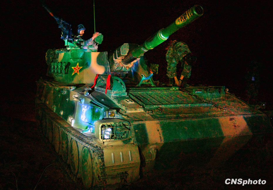 當(dāng)晚國防大學(xué)防務(wù)學(xué)院、空軍指揮學(xué)院的外軍學(xué)員,以及英國、以色列、土耳其、巴基斯坦等國軍事觀察員親臨現(xiàn)場觀摩了后勤保障戰(zhàn)斗準(zhǔn)備、自行榴彈炮占領(lǐng)陣地、裝甲車輛“摸黑”開進等戰(zhàn)斗要素。圖為“摸黑”進入陣地的主戰(zhàn)坦克。中新社發(fā) 宋吉河 攝