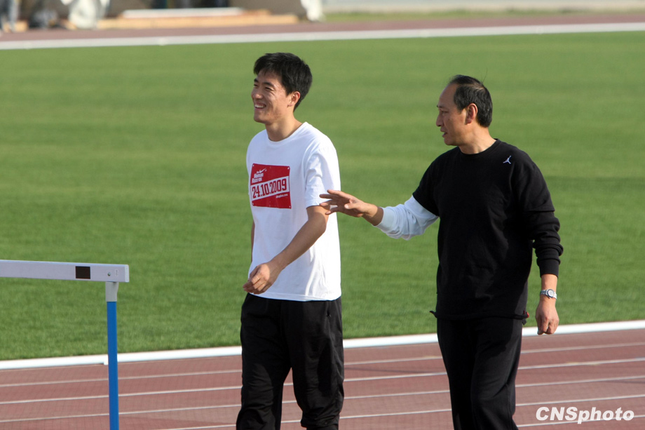 10月22日下午,“飛人”劉翔亮相濟(jì)南奧體中心田徑訓(xùn)練場,在教練孫海平的帶領(lǐng)下,輕松備戰(zhàn)全運(yùn)會(huì)。中新社發(fā) 湯彥俊 攝