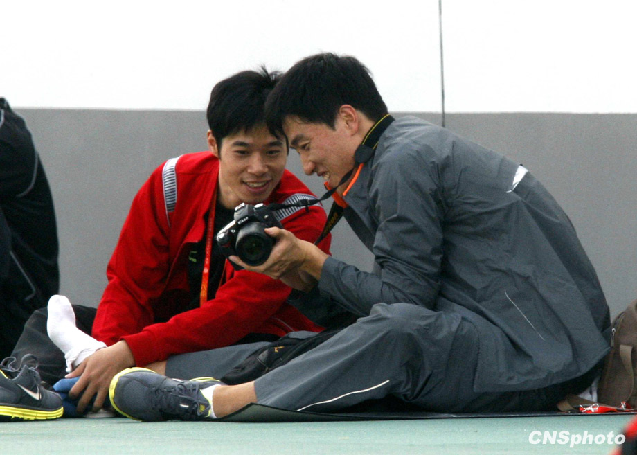 10月22日下午,“飛人”劉翔亮相濟(jì)南奧體中心田徑訓(xùn)練場,訓(xùn)練間隙手拿相機(jī),客串?dāng)z影記者。中新社發(fā) 張宇 攝