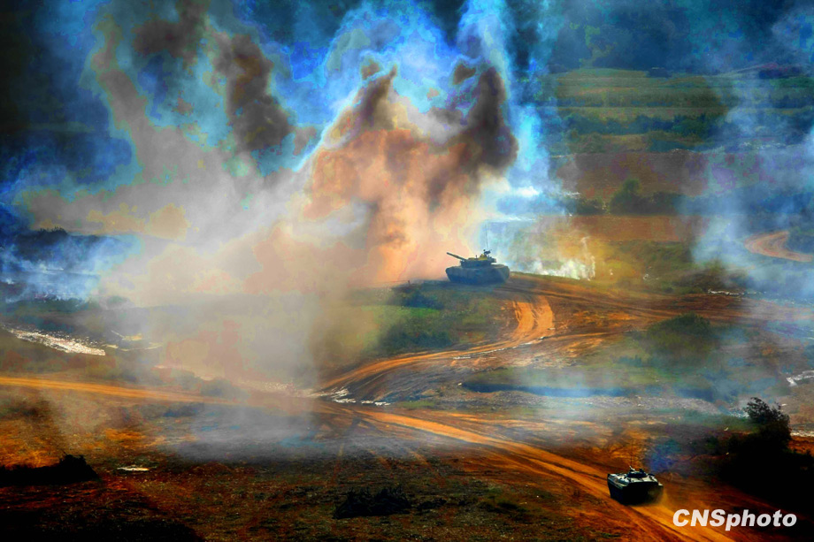 解放軍“前鋒-二00九A”演習(xí),二十二日在濟南軍區(qū)某合同戰(zhàn)術(shù)訓(xùn)練基地進行陸空聯(lián)合火力打擊實兵實彈演練。中新社發(fā) 宋吉河 攝