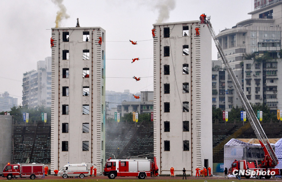 10月23日下午3時40分,推進(jìn)“平安重慶”建設(shè)突發(fā)事件應(yīng)急演練在該市渝中區(qū)大田灣體育場舉行,重慶各警種突精銳力量重裝登場,將各類事件一一化解。圖為高層建筑滅火救援中,消防官兵鉤梯聯(lián)掛展開高樓營救工作。中新社發(fā) 曹多然 攝