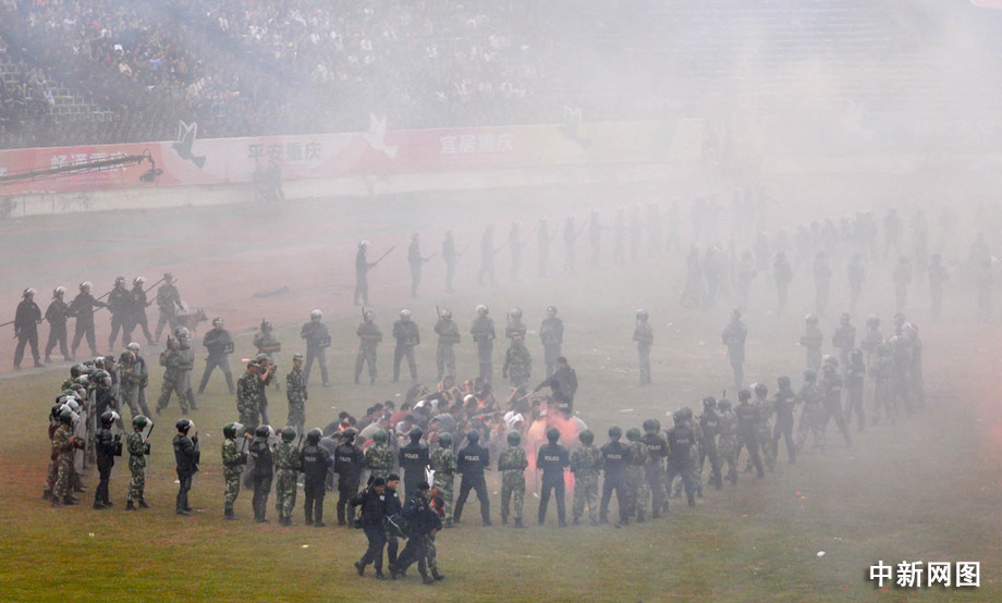 特警隊(duì)員兵分兩路,與瘋狂的“暴徒”對(duì)抗,現(xiàn)場(chǎng)指揮員命令特警隊(duì)員、武警兵力成“穿插分割” 隊(duì)形向前推進(jìn),形成T字隊(duì)形將鬧事人群進(jìn)行分割、推進(jìn),但部分“暴徒”仍負(fù)隅頑抗,特警隊(duì)員將鬧事人群控制在范圍之內(nèi),并追擊企圖逃串的領(lǐng)頭分子,并采用網(wǎng)槍、徒手格斗、警械約束等方式實(shí)施抓捕并帶離。瘋狂的“暴徒”終于在正義的打擊下俯首就擒。